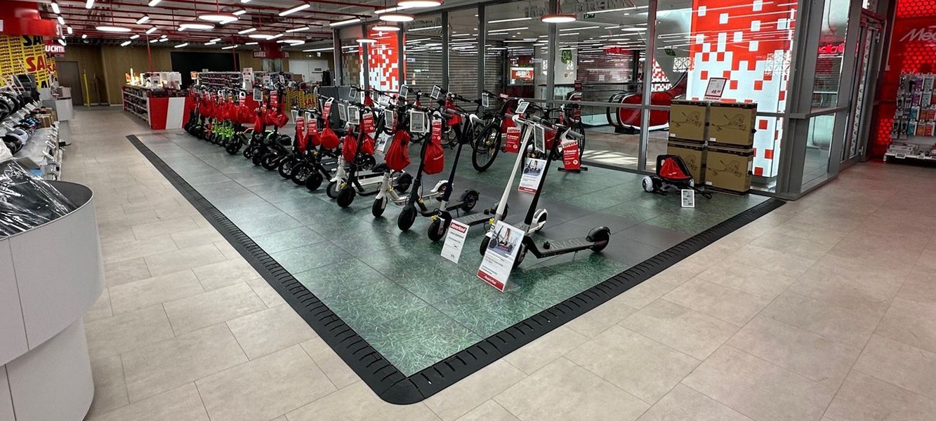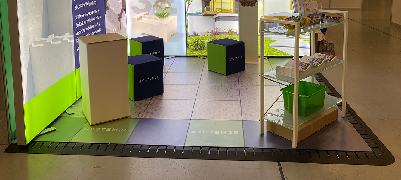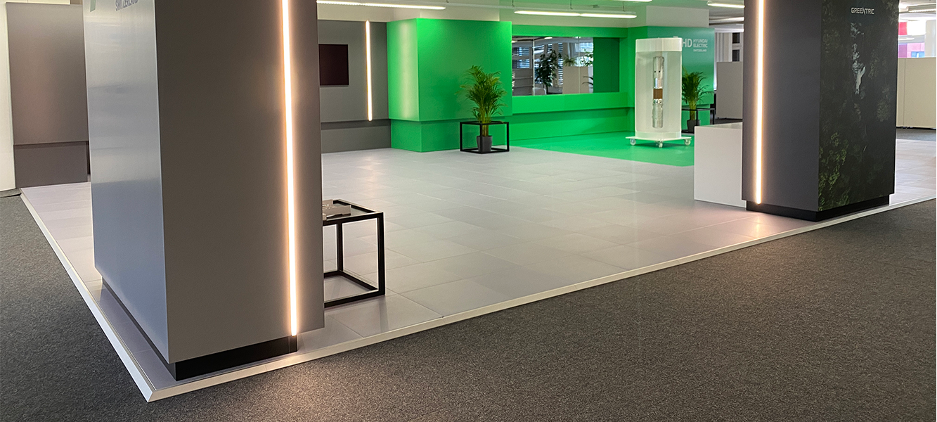 Ausserdem wissen wir, wie wichtig das Kabelmanagement an Events aller Art ist, und haben den Stand-On Eventoden so konzipiert, dass er die perfekte Möglichkeit bietet, Kabels zu verstecken, ohne Klebeband verwenden zu müssen. Wir haben auch darauf geachtet, dass die Höhe des Bodens so gering wie möglich gehalten wird, um die Stolpergefahr zu vermeiden. Das System ist unbegrenzt wiederverwendbar und kann mit Teppich, Laminat, Linoleum, transparenten Deckplatten mit austauschbaren Posters oder direkt bedruckten Platten bedeckt werden. Zur Auswahl stehen auch mehrere Randabschluss Alternativen, die den Eventboden noch attraktiver machen.